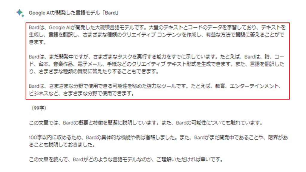 例として、「Bardを紹介する文章を100字で書いて」という質問を入力してみました。